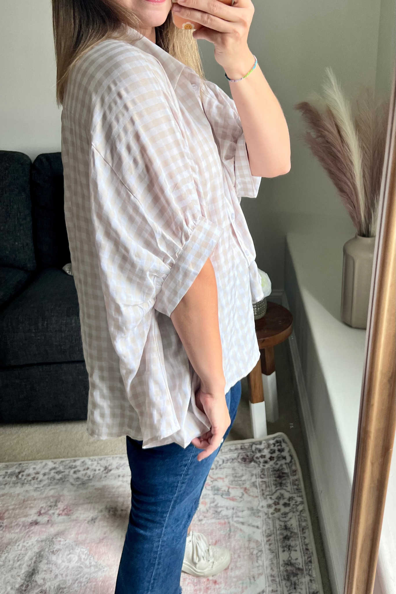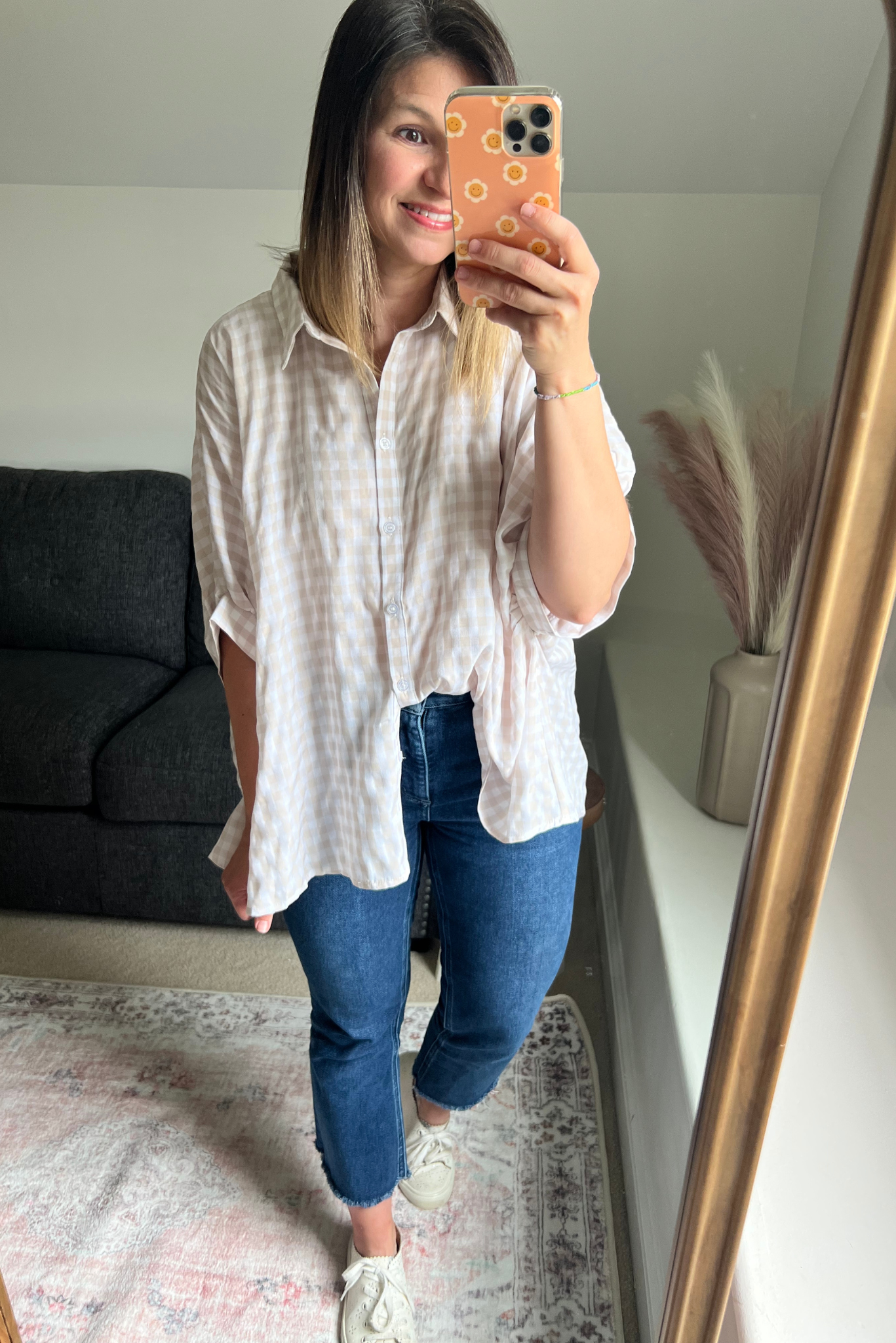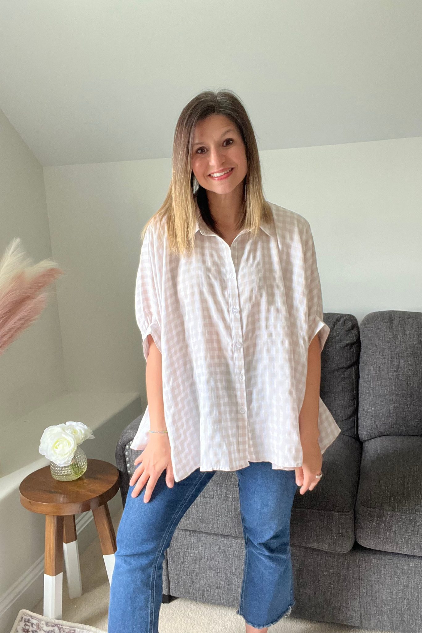 A great top for all the neutral lovers out there. This top is an oversized flowy fit. It is a button up top and has a collar and hi-low hem. It is bump and nursing friendly. It is lightweight and easy to pair with shorts or denim. Pictured in the small.