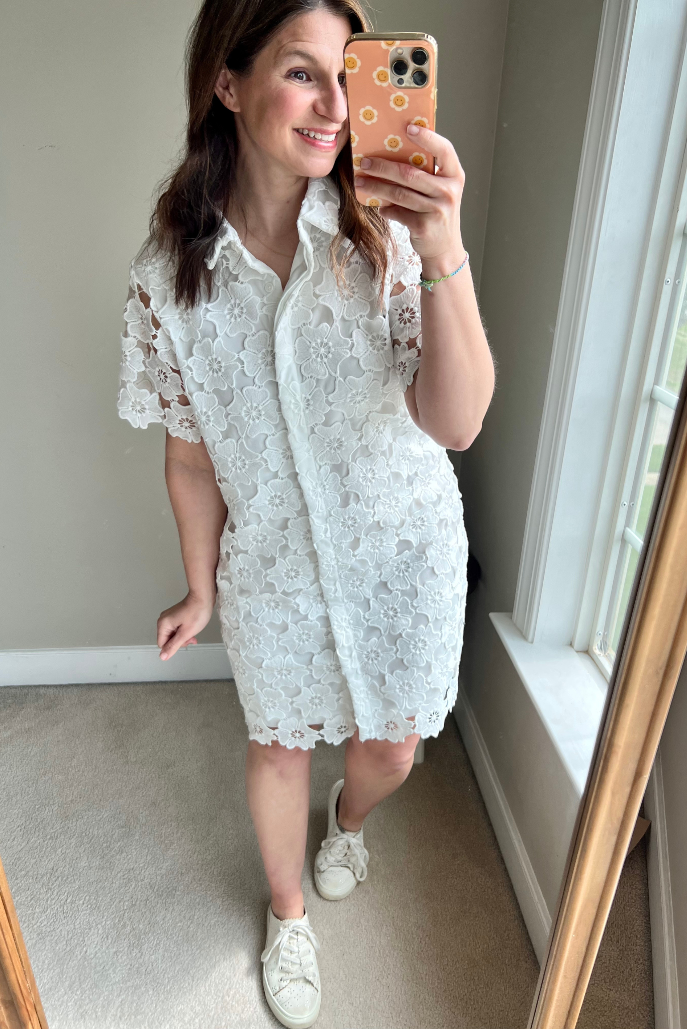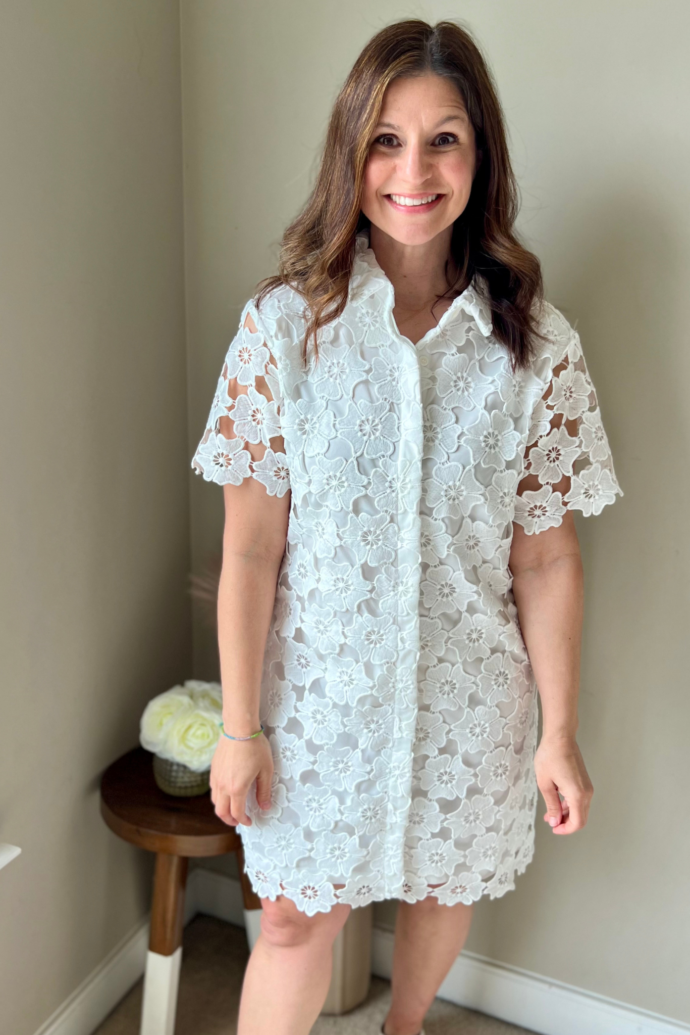 Our Spring Fling Dress is a high quality floral dress. The bright white makes her great for Spring and Summer. It is a button down dress with a collar and floral crochet overlay. She is great for beach vacations and church. She is fully lined and fits true to size. Pictured in the small.
