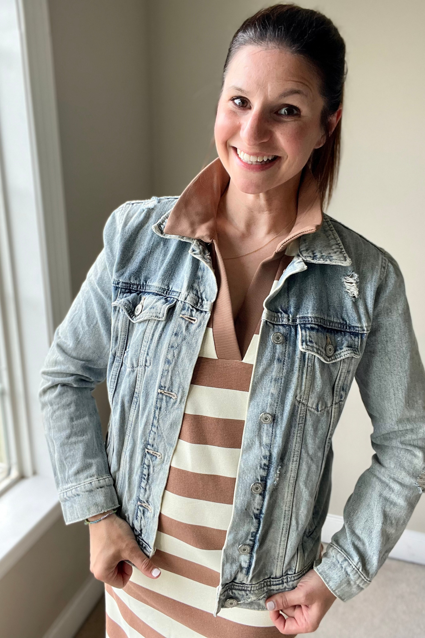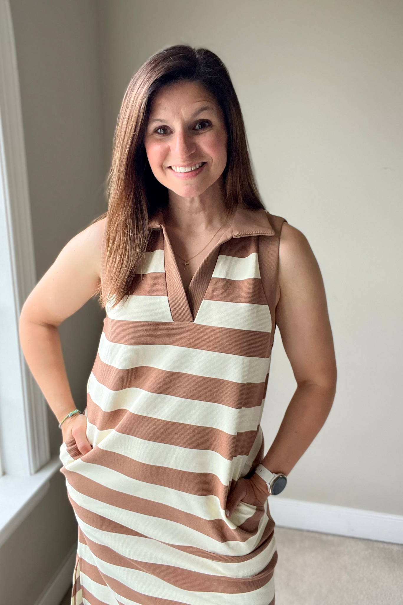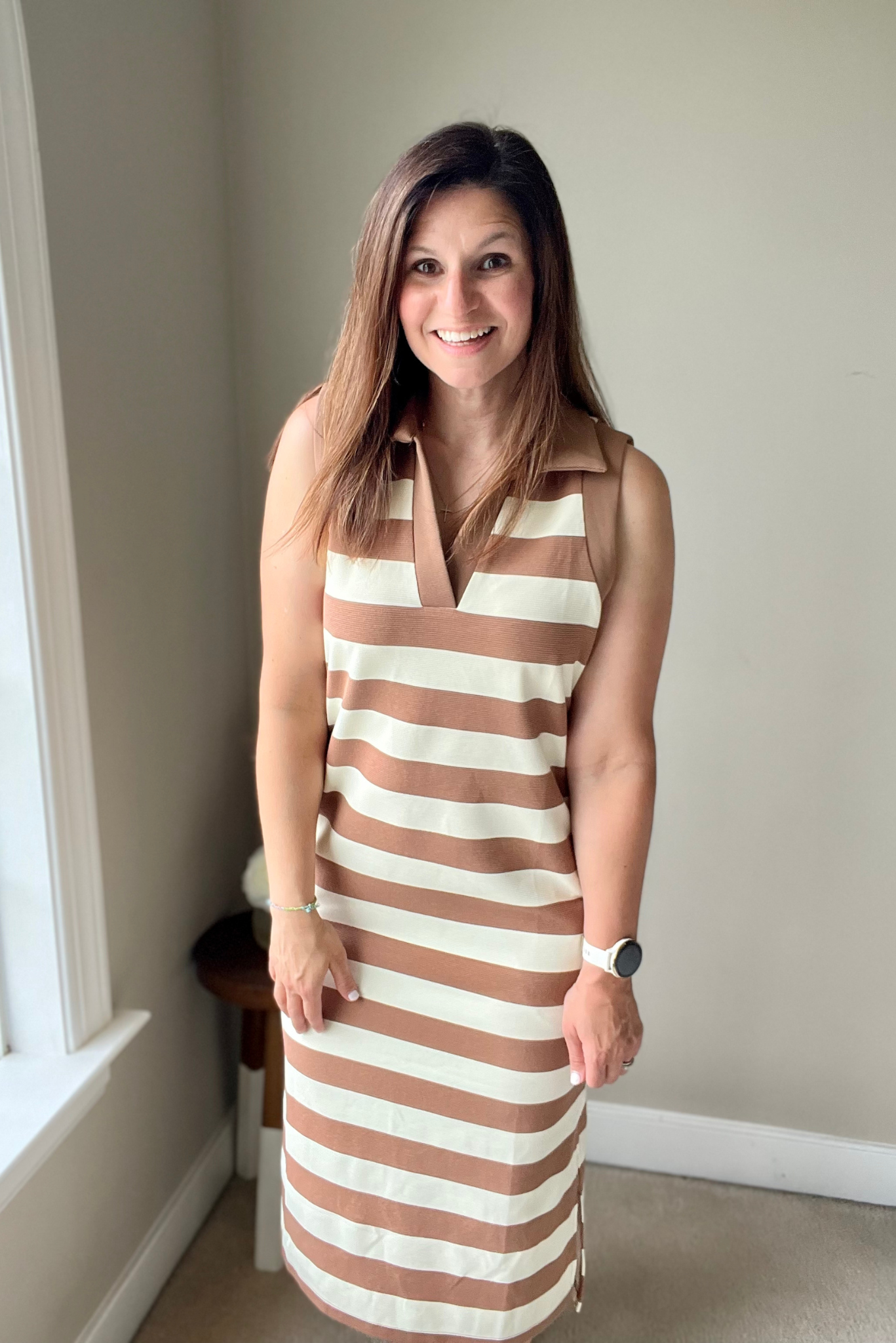 Our Taupe Tank Midi is a dress you can wear now and transition into Fall. It is a medium weight, ribbed material. It features a brown and cream striped pattern, with a solid border on the sleeve and collar. Bonus, she has pockets. The midi length on this one is perfection, and she has slits on both sides, making it easy to move around in. Such an easy option for a casual, put together look. Fit is true to size, pictured in the small.